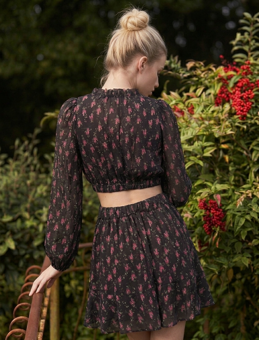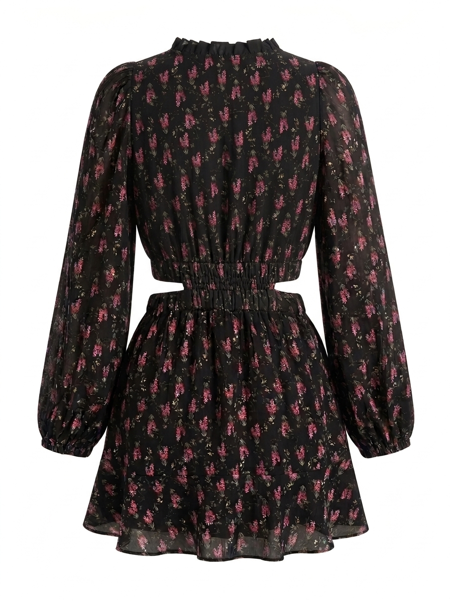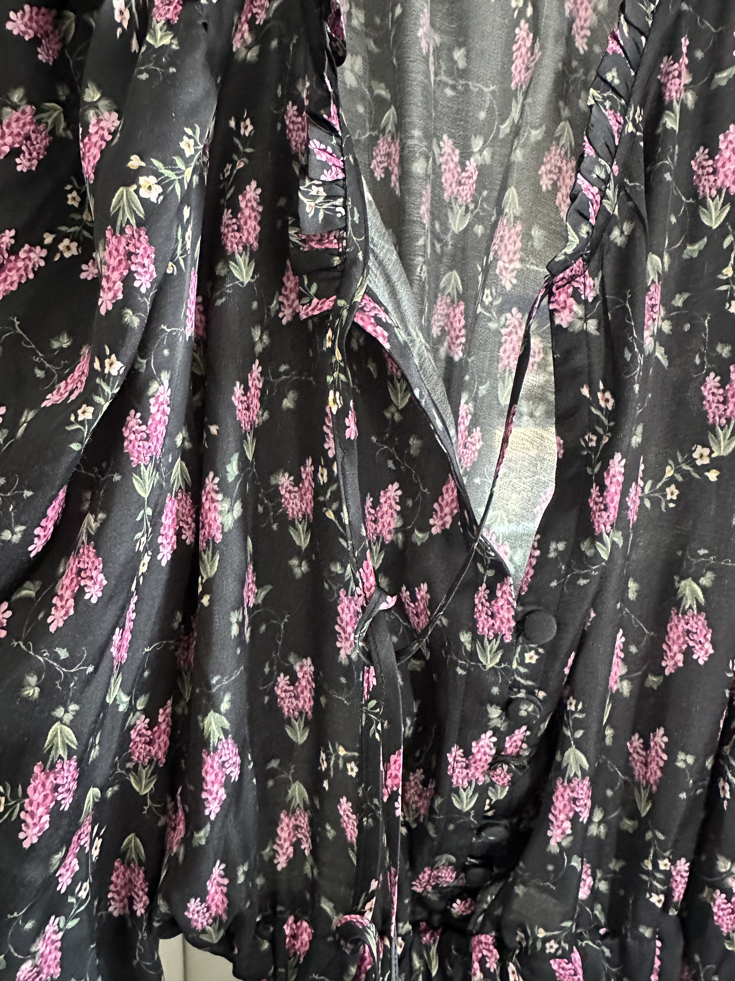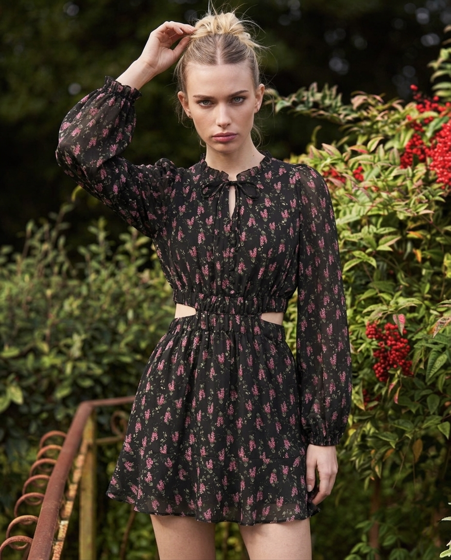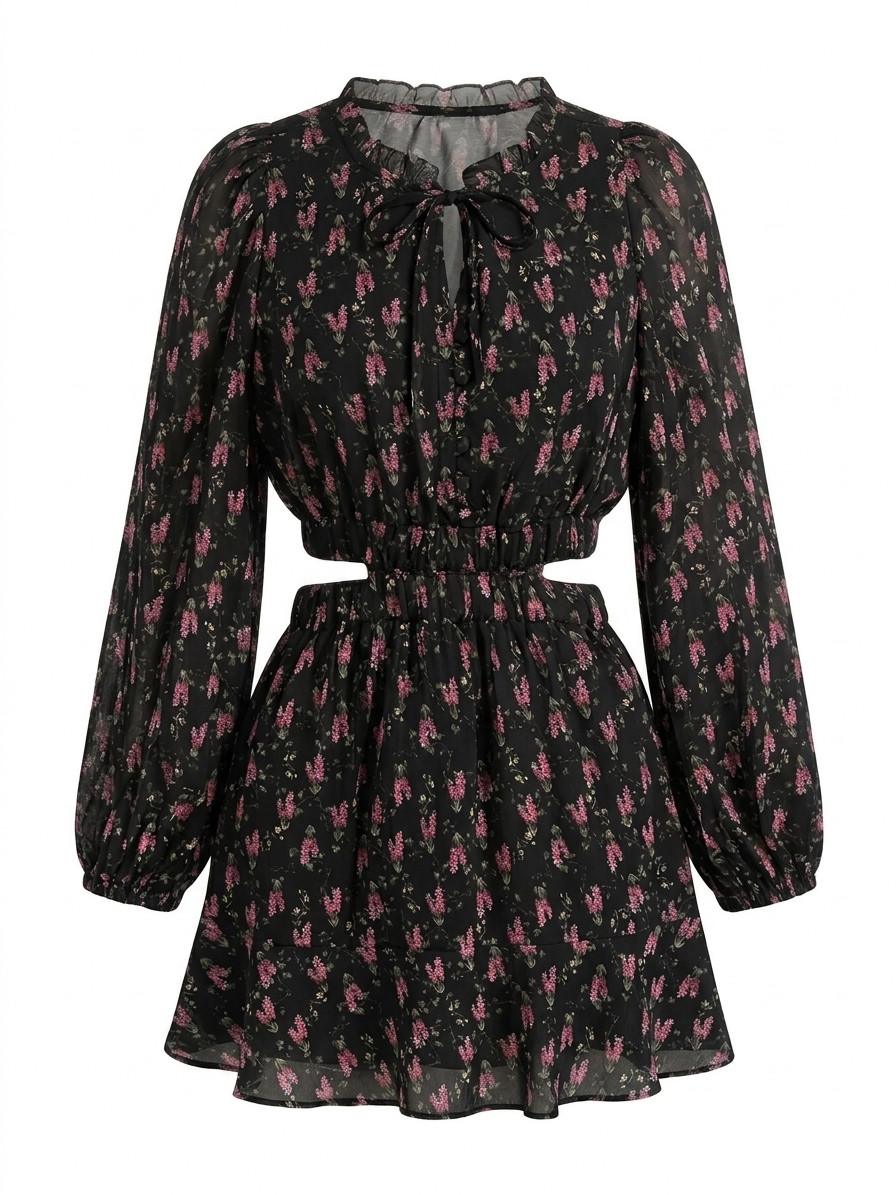 Letnia sukienka DAHLIA w kwiecistym princie, wykonana z wiskozowej tkaniny, satynowej. Z przodu zapinana na powlekane guziki, dodatkowo wiązana pod szyją.